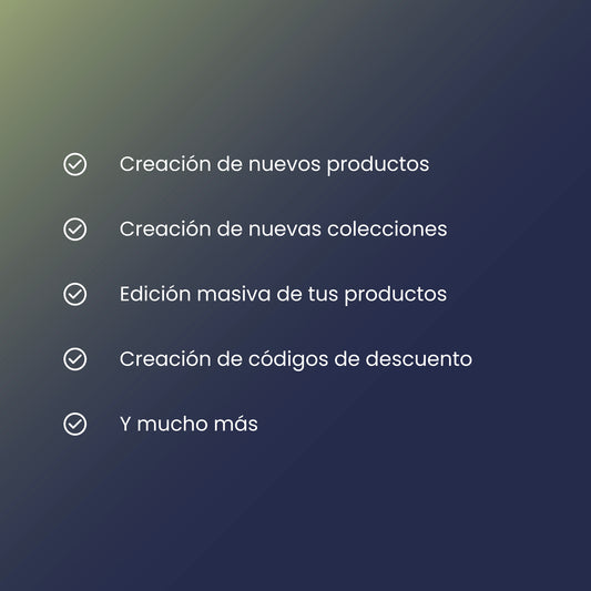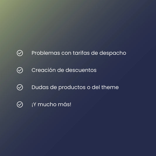Soluciones paquetizadas de soporte en Shopify para problemas del día a día tales como: creación de productos, códigos de descuento, instalación de aplicaciones, resolución de problemas, etc.